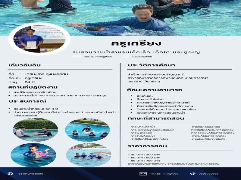 ประสบการณ์การทำงาน 5 ปี มีใบเซอร์สอนว่ายน้ำ เลเวล 1 จากสมาคมว่ายน้ำประเทศไทย